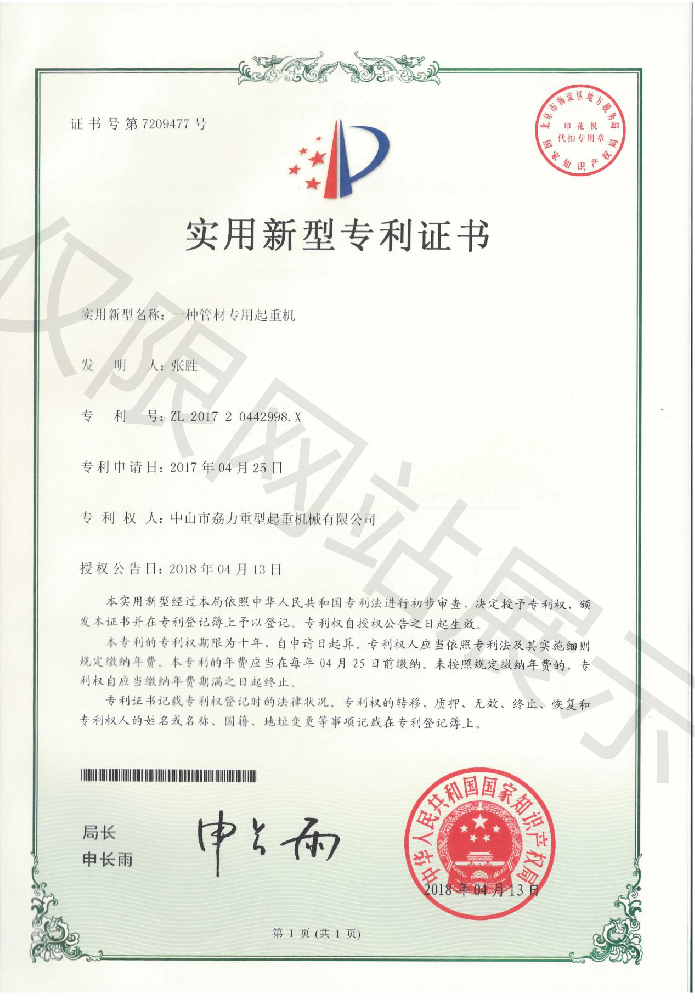 實用新型專利證書 -- 管材專用起重機